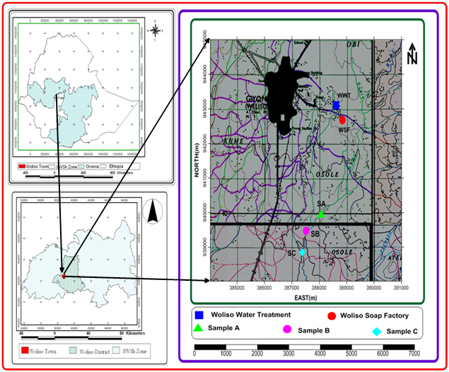 Rebu River is one of the largest rivers found around Woliso town. As the river runs along the side of the town (at the South eastern part), it could be fed with contaminants brought by run-off from the upload into the river at the peak of the floods, discharge from municipal wastes, and industrial wastes from soap and detergent factory. At the effluent discharge site, the water is highly colored, turbid and the vegetation’s along the river appears scorched despite the fact that water from this river is the major source in the area. Since there is no municipal water supply for the local communities living around the river, they rely on this untreated river water for drinking, irrigation and other household purposes. The environment damage caused by water pollution from municipal discharge and industrial (soap and detergent) effluent in Rebu River has not studied yet. These create an urgent need to assess the level of pollution of the river through the consideration of the impact of effluents from the soap and detergent factory and municipal discharge on water quality of the river (Figure 1).