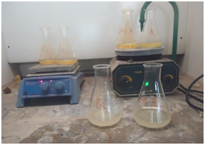 In this study, by following aqueous sample digestion procedures,36 about 100mL of a well-mixed and acid preserved water sample from each sample were taken in separate 250mL Griffin flasks and mixed with a mixture of 2.0mL of HNO3 (69-72%), 1.0mL of HCl (37%) and 0.5mL H2O2 of (30%) solution. The samples have gently heated on hot plate under a fume hood (Figure 3) to not more than 85oC. After the digestion has completed, and then evaporated on to the lowest possible volume (about 20mL).This step takes about 2 to 3hours for 100mL aliquot with the rate of evaporation rapidly increasing as the sample volume approaches 20mL. Vigorous boiling has avoided preventing loss of the HCl- H2O2 azeotrope. The flasks have covered with a watch glass to prevent sample contamination from the fume hood environment. The flasks have allowed cooling. Then, the digested samples have filtered through glass fiber filters prior to analysis. The filtrates have transferred to 50mL volumetric flasks and diluted to the mark with distilled water. The digested samples have preserved in refrigerator for analysis. These solutions have then used for the elemental analysis. La (NO3)2 was used during spiking the sample to minimized the matrix effect.