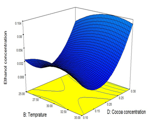 The effect of temperature and cocoa waste concentration on ethanol production are shown in Figure 2A. Base on the results, ethanol production increased proportionally with an increase in temperature from 27.5°C to 32.5°C. Hence, CW concentration increased while the ethanol concentration was constant. Figure 2B indicates that ethanol production in the middle range of inoculum (9%) increased significantly. Similarly, by increasing the temperature, a smooth decline in ethanol production observed. Subsequently, these two parameters had highest contribution in ethanol production.