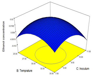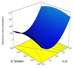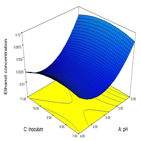 As mentioned earlier, ethanol production increased at middle range of inoculum and temperature. Consequently, higher ethanol concentration obtained while pH increased and the inoculum size was constant. Interaction of pH and temperature showed that they have same effect on ethanol production. It means by increasing pH and temperature the athanol production increased. The 3D response surface plots in Figure 3 shows pH was the most significant variable for ethanol production. It indicates that in higher pH, the production was higher while, temperature was not contributed significntly in ethanol production.