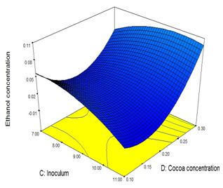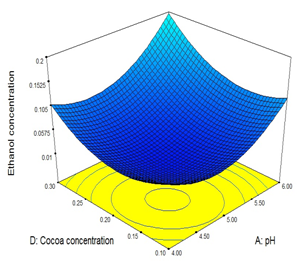 In this study, central composite design (CCD) was used to evaluate the interactions and effect of four factors including pH, temperature, inoculum and cocoa waste concentration for ethanol production. The experiments were designed and analyzed using Design Expert Software version 6.4 and each expriement done in triplicate.