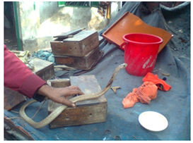 Snakes are kept in a wooden box (12x12x3 inches). Very congested space is very harmful for its breeding. In cold season some snakes die. Each snake needs two hours sunlight everyday (Figure 1). Body temperature of a diseased snake is high and it shows very anger and enlarges its eye. This situation is very dangerous while performing.