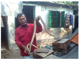Snake charmer does not use any kits for snake catching. They catch snake by open hand. They just try to concentrate snakes eye to the charmers’ hand one hand and by using another hand they hold the head/neck of that snake. If that snake sudden moves back it may bites. Snake charmers know about snake catching sticks like L stick, T stick, Y stick and grab stick. Snake charmer does not catch that snake which has eggs in their ovary. Snake charmer, Md. Abul Kashem had a trained mongoose which played with snakes. If pet mongoose is well-trained not happen any harms for snakes otherwise for mongoose’s bites snakes may die