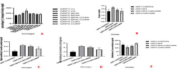 Result shows relative increase in body weight across group between the initial body weight of animal and their final body weight but body weights of animals treated with both bisphenol A and curcumin (group three) and curcumin only (group four) gained less weight compared to the other groups. There was a relative increase in body weight of the control group (group one), while the group treated with bisphenol A only (group two) showed high increase in body weight Figure 1,2.