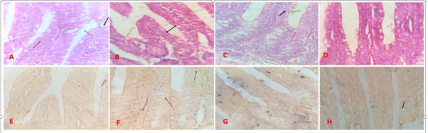 D-Photomicrograph of jejunum of rats administered curcumin showed normal villi with goblet cells (black arrow) with fine epithelium (blue arrow). Goblet cells (orange arrow) and enterocytes (blue arrow). (H & E. X400).