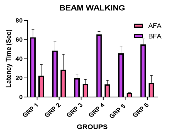 To evaluate changes in the rats' motor coordination following the treatment with orijin bitters and aqueous extracts of Hibiscus sabdariffa calyces and Zingiber officinale Roscoe Rhizome, a beam-walking test was conducted both prior to and after the administration. The time (in seconds), also known as latency, taken by the animals to traverse the beam from the starting point A to the safety box B, was used to assess learning and memory.31