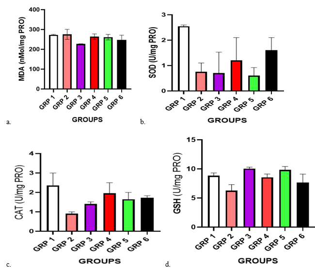The antioxidant activities of catalase (CAT) was also notably increased in all treatment groups when compared to group 2 (Figure 2c). The antioxidant activities of Glutathione (GSH) was low in group 2 (orijin bitters) but high in group 1 (control group) and experimental groups (3, 4, 5 and 6) (Figure 2d). There however, was no statistical significance (P <0.05) for all the results of biochemical analyses.