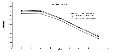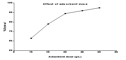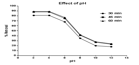 Effect of pH: The influence of pH value on the amount of COD removed by entrapped activated carbon in alginate from the aqueous solution was estimated by carrying out experiments with different solution pH (1, 3, 5, 7 and 9) at different contact time (30, 60 and 120min), and plots of the pH against the percentage of COD that was removed from the solution are shown in Figure 1. The conditions used were: the initial COD concentration was 500mg\L, the adsorbent dosage 30g and the stirring rate fixed at 100rpm. The optimum pH for the removal was 3. The pH of the aqueous solution plays a decisive role in affecting COD adsorption. Similar results were reported in the scientific literature for the removal of COD.48,49 At lower pH levels, the removal sharply increased because the positively charged functional groups of organic molecules bind through electrostatic attraction to the negatively charged of the surface of the adsorbent. On another hand, at higher pH the reduction in adsorption due to the increase of hindrance to organic ions diffusion because of that the abundance of (OH)- ions leads to repulsion between the organic molecules and the surface of the adsorbent.50–55