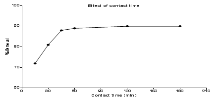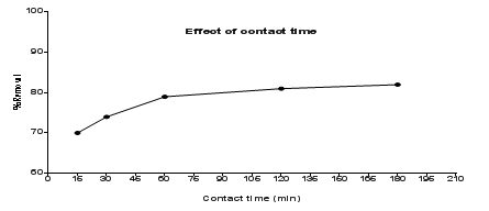 Effect of contact time: The contact time is important operational factor affect removal efficiency. Figure 7 depicts phosphate removal as a function of contact time (Table 7). From Figure 7, it is shown that by increasing in contact time lead to increase removal efficiency. As shown, the phosphate uptake by entrapped activated carbon in alginate was very rapid within the first 15min. After 15min, the uptake of phosphate progressively decreased with time. As the treatment time proceeded, the adsorbent sites had the inclination toward saturation. Equilibrium was established at 45min; other factors such as pH, initial phosphate concentrations, stirring rate, and adsorbent dose were 4, 5mg\L, 100rpm, and 30g, respectively. Similar results were reported in the scientific literature for the adsorption of phosphate.26,77 By Increasing in time leads to increase in the contact between the phosphate ions to the larger surface area available of adsorbent as there are lots of free active sites for the adsorption.40,58,59,63,75