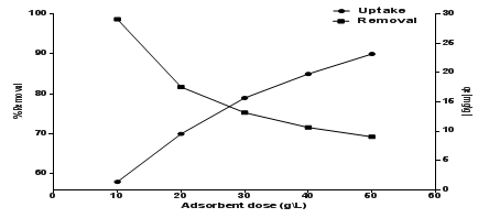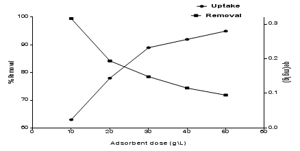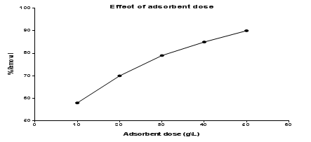 Effect of adsorbent dose: Figure 8A depicts phosphate removal efficiency as a function of adsorbents dosage. The adsorbent doses were varied between 10 and 50g/L, other operational factors (pH, contact time, initial phosphate concentrations and stirring rate) were 4, 45min, 5mg\L, and 100rpm, respectively. The optimum adsorbent dose for phosphate ions removal was found to be about 25g (Figure 8B). As expected, at high adsorbent does the removal increased because of the increased adsorbent surface area and the number of available adsorption sites increased (Table 8).80