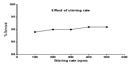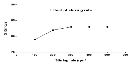 Effect of stirring rate: Figure 4 depicts COD removal efficiency by entrapped activated carbon in alginate as a function of stirring rate (Table 4). The stirring rate was varied between 100 and 500rpm, other operational factors (pH, contact time, initial concentration and adsorbents dosage) were 3,60min, 500mg\L, and 30g\L, respectively. The optimum stirring rate for COD removal was 100rpm. By increasing in stirring speed resulting to increasing in COD percentage removal, was due to the fact that, increasing in stirring rate enhanced the contaminants diffusion of COD content on the surface of the adsorbent.63,65