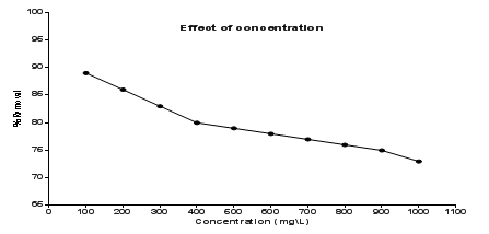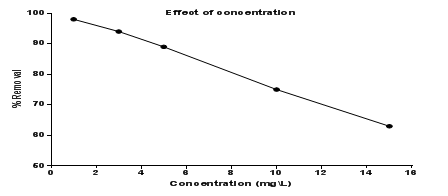 Effect of the initial concentration: The effect of concentration of the aqueous solution on the percent phosphate reduction by entrapped activated carbon in alginate was studied at various initial concentrations, as shown in Figure 10A, other operational factors (pH, contact time, stirring rate and adsorbents dosage) were 4, 45 min, 100rpm, and 30g\L, respectively (Table 10A). At the beginning of the adsorption process, the removal efficiency was higher because of the great number of available adsorption active sites of adsorbate molecules but it decreased with time gradually due to the saturation and diminished of this sites, also caused a reduction in removal ratio.