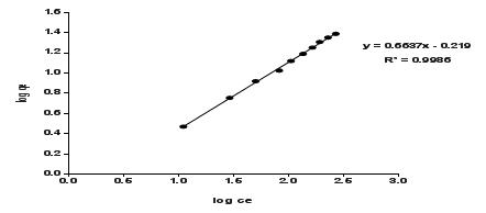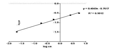 Where Kf ((mg/g) (mg/L)-1/n) and n (dimensionless) are Freundlich constant related to the adsorption capacity and adsorption intensity, respectively. (Kf) and (n) evaluated by plotting ln qe and ln Ce.