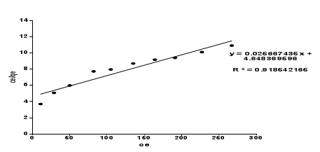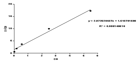 Langmuir isotherm model assumes monolayer coverage of adsorbate over a homogeneous surface of adsorbent.46 The Langmuir linearized model is given by the equation: