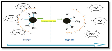 Effect of pH: The influence of pH value on the amount of phosphate ions removed by entrapped activated carbon in alginate from the aqueous solution was estimated by carrying out experiments with different solution pH (2, 4, 6, 8, 10 and 12) at different contact time (30, 45 and 60min), and plots of the pH against the percentage of the phosphate ions that was removed from the solution are shown in Figure 6A. The conditions used were: the initial phosphate ions concentration was (5mg\L), the adsorbent dosage (30g) and the stirring rate fixed at 100 rpm. The optimum pH for the removal was 4. The pH of the aqueous solution plays a decisive role in affecting ascorbic acid and lactose adsorption (Table 6). Similar results were reported in the scientific literature for the adsorption of.71–74 In most systems, the absorption of anions like phosphate decreases with the increase of pH and surface charge becomes more negative.75,76 The surface of the adsorbent became positively charged in acidic medium and negatively charged in alkaline medium. Phosphate ions are negatively charged and it appears that there are repulsion forces between ions and the negatively charged adsorbent surface in alkaline medium because of that abundance of (OH)- ions and it appears that there are repulsion forces between phosphate ions and the negatively charged adsorbent surface, as shown in Figure 6B.72–75