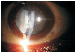 On examination, there was a scar on his scalp with loss of hair. His best corrected visual acuity on Snellen's chart was 6/9 in right eye and 6/30 in left eye. On slit lamp examination lids, conjunctiva, cornea and pupils showed no abnormality in either eye. Right eye had a posterior chamber intraocular lens. Left eye showed multiple, mid-peripheral snowflake - like anterior subcapsular lens opacities (Figure 1). Also a central cortical opacity with shrunken anterior capsule was seen. There was a complete cleavage of cortex and a separation was visible in retro illumination (Figure 2). Fundus examination was unremarkable in right eye and faintly visible in left eye.