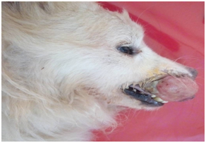 In single case of acanthomatous epulis, chemotherapeutic agent-nanosomal Paclitaxel was given as distant pulmonary metastasis was also recorded in this case. Though, there was some regression of tumour mass recorded after first dose of chemotherapy, however, even after third dose of chemotherapy this regression was unsatisfactory. Tumour mass became more aggressive and ulcerated with profound foul smelling along with continuous bloody discharge. Animal’s condition deteriorated drastically. As per request of the animal owner, euthanasia was performed, as owner was not interested to further chemotherapy or any surgery (partial mandibulectomy).