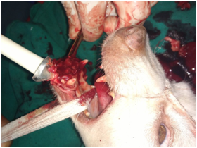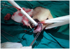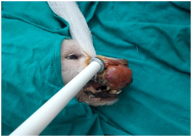 All the animals were hospitalized for 5days. Postoperative analgesia was provided by Meloxicam @0.1mg/Kg body weight intramuscularly and Ceftriaxone sodium @ 10mg/kg body weight intramuscularly, once daily for five days. Surgical site was dressed twice daily with diluted Povidone iodine solution. All the cases were under surveillance for six months post-surgery for any recurrence, if any, by regular telephone conversions with the pet owners.