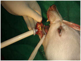 All animals were premedicated with Atropine sulphate @ 0.04mg/kg body weight subcutaneously. After 10 minutes, anaesthesia was followed with Xylazine hydrochloride @ 1mg/kg body weight intramuscularly followed by induction with Ketamine hydrochloride @5mg/kg body weight after 10minutes. If required, anesthesia stage was prolonged by intravenous administration of combination of Ketamine hydrochloride @5g/kg body weight and Diazepam @ 0.2/kg body weight. The animals were kept in lateral recumbency with the affected part on the upper side. The surgical site was prepared for aseptic surgery and resection of the mass was done using nitrous oxide cryoprobe. Tumour masses were excised at the base level surrounding gingival mucosa. A cryosurgery system with continuous circulation contact tips was used (Figures 2A−2F). Two freezing cycles were applied. After the resection of the mass, the area, if required, coagulative sponge was applied for few minutes to stop further bleeding. The cryonecrotic scar, if any, was allowed to slough naturally.