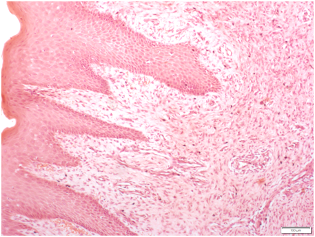 Canine epulis are the fourth most common oral tumour in dogs and more incidences in brachyecephalic breeds, however, in this study it was mostly found in Spitz. Among the three types of epulis, fibromatous epulis is more common in canines. The etiology of canine epulides is not known so far. In canine, fibromatous epulis is characterized histopathologically by a mass of cellular, fibroblastic connective tissue which is separated from the surface epithelium by a zone of normal fibrous connective tissue.8,9 It generally does not invaded into the bone or mandible and occurred in canines over 5years of age. Similar clinical and histopathological lesions of fibromatous epulis also observed in this study in five clinical cases involving either upper or lower jaw and all cases were aged above 5years.