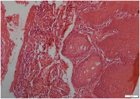 In canine, acanthomatous epulis are common and it’s characterized by its aggressiveness and invasiveness to the bone. It generally destroys the bony structure and can occur in any part of the jaws,10 however, more incidences in the anterior part of the mandible.8,11 Histopathologically, the basal cells are palisades, columnar and exhibited cytoplasmic vacuolation. Similar clinical and histopathological lesions were recorded in one case of acanthomatous epulis in this study.