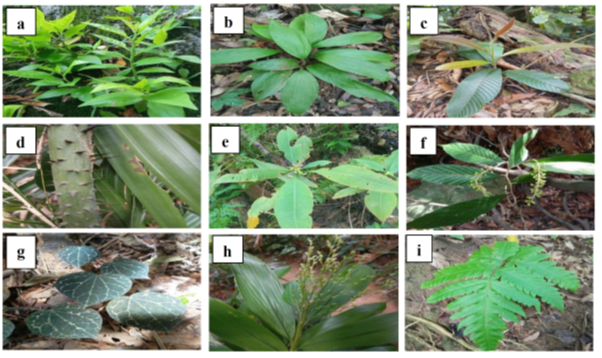 Figure 2 Plant species documented (a) Justicia gendarussa (b) Tacca cristata (c) Dipterocarpus grandifloras (d) Salacca zalacca (e) Greenea corymbosa (Jack) Voigt (f) Tectaria fauriei (g) Piper porphyrophyllum (h) Setaria palmifolia (i) Tectaria stenosemioides.