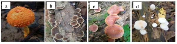 Figure 3 Fungal species documented (a) Cryptotama asprata (b) Podoscypha gillesii (c) Gymnopus dryophilus (d) Amanita specie.