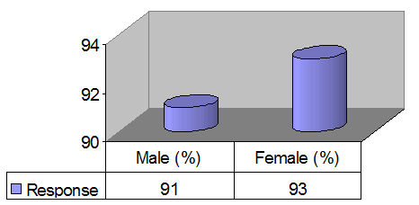 In order to assess the government campaign outcomes regarding educating the peoples about possible causes of HIV/AIDS questions were asked from student. It is observed from Table 4 that 43% male and 46.5% respondents got awareness from TV messages about HIV/AIDS; 22.5% male and 23.5% female respondents report that they got awareness of dangerous practices which may lead to HIV/AIDS; 9.5% male and 7.5% female respondents believe that they got frightening messages from T.V. and 8.5% male and 8% female respondents believe that said the messages have no effect. On the basis of Chisquare test, it is observed that statistically there is a nonsignificant difference between male and female respondents. The results obtained are in agreement with earlier studies (Atif et al.,10 (Table 4), (Figure 1)).