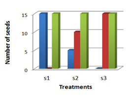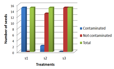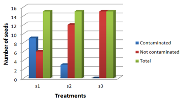 The efficiency of each disinfection treatment for each species was evaluated, considering the number of contaminated and non-contaminated seeds with respect to the total). Likewise, it was observed that s3 treatment was efficient for all seed species (Figure 1–4), since 100% of experimental units were obtained without contamination. This treatment was the longest time of immersion and concentration of sodium hypochlorite, that is, 20% of sodium hypochlorite for 20min. On the other hand, the results show that at lower concentration and contact time with the disinfectant agent, the plant materials used showed greater contamination (analyze the treatment s1 in Figures 1–4).