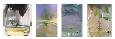 Figure 7 In vitro seedling growth obtained from Dahlia cordifolia meristem. (a) one week of incubation, (b) two weeks of incubation, (c) 3 weeks of incubation and (d) 4 weeks of incubation.
