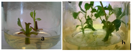 In the case of Dahlia australis, the micro propagation was efficient in semi-solid MS medium using the axillary buds as explants. New shoots were obtained after 8days of incubation and from these new explants were generated that were grown for the multiplication of the plant material. To make the subcultures it was necessary to dissect the leaves and part of the petiole so that the explants were less heavy. These shoots were used as donors of explants for the induction of callus. The new explants when cultivated presented root formation, without the need to add plant growth regulators (Figure 10). The Dahlia australis presented better growth characteristics to continue with its multiplication due to the vigor of the obtained seedlings and the root formation in comparison with the Dahlia cordifolia.