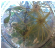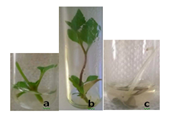 Figure 9 Development of axillary buds of Dahlia cordifolia in liquid medium, at the start of incubation (a), after 8 days (b) and its death by the conditions of the culture vessel.
