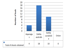 The multiplication of the onion was not efficient, the explants showed no growth. Asparagus presented new buds from the axillary buds and a good growth response was observed in semi-solid MS medium. The number of buds obtained by each species is concentrated in Figure 11.