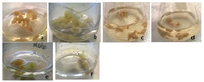 The dissection was performed to fragment the friable calli and establish the cells in suspension (Figure 12c–f). Once the biomass increased, they were subculture to fresh culture medium for expansion and maintenance. In the case of asparagus, greater growth and greenery were observed (Figure 12e & f). It should be mentioned that antioxidants were not used. There is little information on the establishment of cell suspensions of these species and in the experimental conditions used they present a good response, so they can be an option to obtain biomass of these species in a short time.