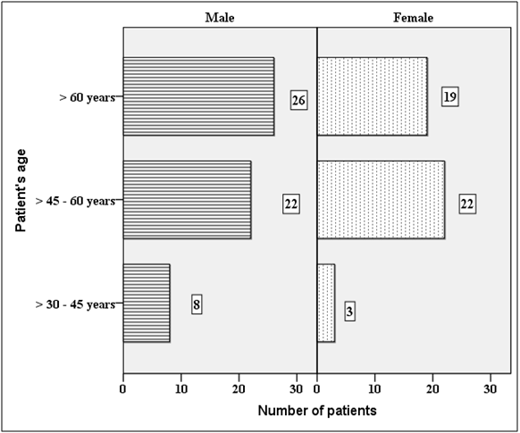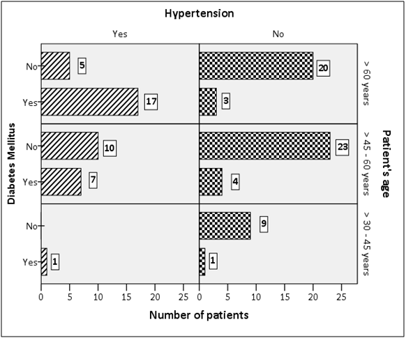 A total of 100 patients participated in our study of whom, 56 were male and 44 were female. Majority of male patients (46%) were more than 60 years of age while majority of female (50 %) were aged 45 to 60 years (Figure 1). Majority of patients (17 out of 25) with both diabetes and hypertension were in the highest age group (> 60 years) (Figure 2). Level of awareness regarding smoking, physical exercise and obesity was very low as majority of patients didn’t know the difference these risk factors make. For instance; of sedentary people (87 out of 100), 51% didn’t know whether smoking affects heart attack or not, 50 % had no idea regarding benefits of exercise and 34 % didn’t know how obesity affects risk of heart disease. 80% of current and 85% of ex-smokers considered smoking as risky while 70% of non-smokers didn’t know whether smoking makes any difference or not (Table 1). Patient’s opinion regarding fruit, vegetables, fatty food and oil or ghee was assessed in coherence with their level of education. It turned out that patient having high level of education had better knowledge regarding safe diet as compared to those having little or no education. For example, 35% people with no education considered no difference between oil and ghee as compared to 15% people with secondary education. Also only 26% of illiterate people considered oil better than ghee while 87% of people with secondary education considered oil better than ghee (Table 2).
