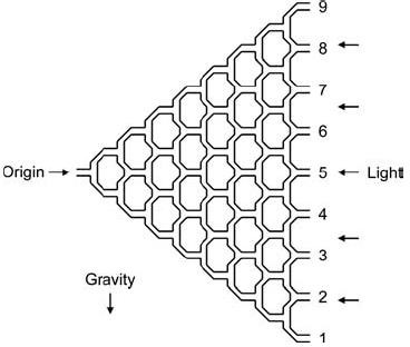 The apparatus for fractionating flies according to geotaxis used in the five-hundred- generation mass selection experiment of Hirsch and coworkers.21,22 The flies are released at the origin and move to the right attracted by light, having to choose at each fork whether they move up or down. Traps at the end collect flies according to their geotaxis score, from 1 (strong positive geotaxis) to 9 (strong negative geotaxis). The result, above, relates just to the combined choices of one fly. But how many flies are released at the origin?! Such number corresponds to each fly.