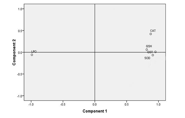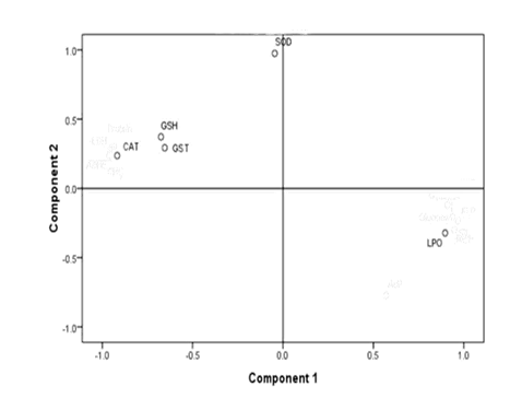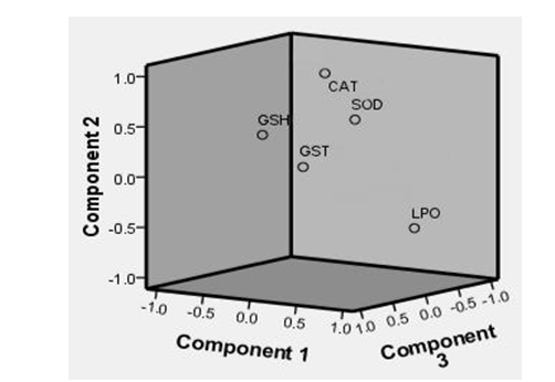 To explore overall relationships between the different oxidative indices, PCA from component matrix data was made. The results showed that on exposure of the fish to the toxicant, 90.45% of overall variance was explained by the first two principal components in liver. The principle component I (71.41% of variance) was built by LPO, GSH, GST, CAT & SOD. The principle component II (19.04 % of variance) was formed by CAT. Vector plot made on the basis of PCA, showed that there was a relationship between GSH, GST & SOD (Figure 1). In kidney 93.91% of overall variance was explained by the first three principal components. The first principle component (59.21% of variance) was built by LPO, GSH, GST, CAT & SOD. The principle component (22.33% of variance) was formed by CAT, LPO, GSH & GST. The principle component III (12.38% of variance) was formed by CAT, LPO &GST. Vector plot made on the basis of PCA, showed that there was a relationship between CAT & SOD (Figure 2). In gills, 92.45% of overall variance was explained by the first two principal components. The first principle component (83.27% of variance) was built by LPO, GSH, GST, CAT & SOD. The principle component (9.18% of variance) was formed by GST & SOD. Vector plot made on the basis of PCA, showed that there was a relationship between GSH & GST (Figure 3).