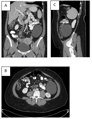 Figure 1 A) Contrast-enhanced computed tomography scan of the abdomen in the coronal plane shows a left retroperitoneal cystic lesion.