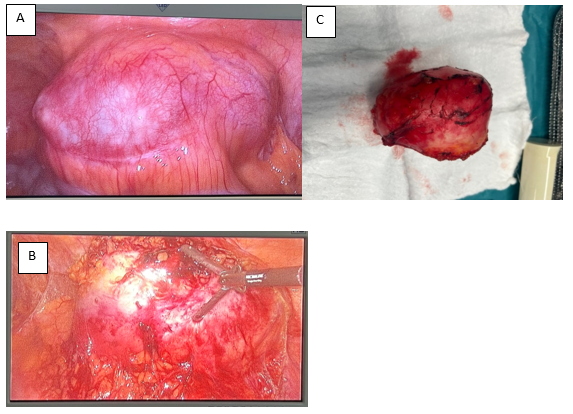 Figure 2 A) Laparoscopic excision, left flank with colon displaced to medial and mass rising from retroperitoneum.