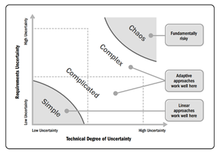 The hybrid management methodology for construction projects developed in this research uses a traditional approach throughout the entire project life cycle, simultaneously combined with an agile approach applied to the process groups recommended by the ISO 21500:2012 Project Management Standard; as shown in Figure 1. It is important to remember that each project is unique by nature and the adaptation of the hybrid methodology to be used must be done considering its specific characteristics and constraints: scope, schedule, cost, resources, quality, and risks, where the importance of each one changes with the objectives of each project. Consideration should also be given to the project environment, organizational culture, stakeholder needs and governance. The Figure 2 presents the uncertainty and complexity model to determine the most appropriate approach for the project. The agile methods used as a complement to the traditional methodology, analyzed in this research were selected according to the following criteria: More holistic agile frameworks, oriented to a broad set of project activities. Common use in a variety of contexts. Popularity of application adopted by various industries. Characteristics applicable to the construction industry and the results of the research questionnaire. Based on the above criteria, the agile methods selected were Scrum, Kanban, Lean Construction, Scrumban, Feature Driven Development and the Dynamic Systems Development Method. According to the analysis and validation of the hybrid methodology, the agile methods compatible with the characteristics and requirements of the construction sector that complement the traditional methodology are: Scrumban and Lean Construction.