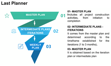 If the scope, objectives, or risks sof the project are not completely clear from the beginning, by applying the hybrid methodology, it is possible to define them in a general way at the beginning and to detail them as the project progresses. With each iteration you gain more information, clarity of requirements and customer needs, and should include the real problems that are discovered during execution. The hybrid methodology is mostly applicable to complex projects with some degree of uncertainty, where the scope becomes better known as the project is executed. To comply with the execution time, the restrictions that prevent the normal development of activities must be analyzed, iterations and weekly planning framed within the initial schedule or the project's master plan must be applied. To strengthen compliance with this constraint (time), which is currently only met in 63.41% of construction projects, the hybrid methodology defines a plan, and the work is executed in short cycles to review results and adapt as necessary. Priorities may change and the plan will need to be adjusted, rapid feedback is required on the work executed and the adequacy of deliverables through iterative scheduling that allows for easy planning, organizing, and prioritizing. In time management, it is important to establish real and achievable objectives, identify and plan the tasks according to the time established in the iterations and prioritize them. Figure 8 shows the processes to be carried out in each iteration to estimate the execution time of the project deliverables. A tool that contributes to the achievement of time compliance is "Last Planner". Its application is simple, requires strict compliance, and is based on increasing the performance of construction activities by decreasing planning uncertainty. As shown in Fig. 9, the master plan covers all project activities from inception to completion. The intermediate or iteration plan is derived from the master plan and can be made for a time frame of one to three months. The weekly plan is determined based on the intermediate or iteration plan and contains the activities to be executed each week budget.