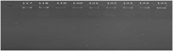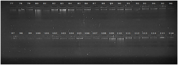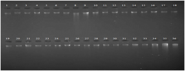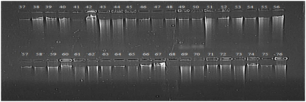 The genomic DNA extracted was checked for its quality and quantity. Agarose gel electrophoresis of all the genotypes was performed to check the purity and integrity of the genomic DNA (Figure 1). The concentration of the genomic DNA was checked on Nano drop spectrophotometer (ND-100) and the results are reported in (Table 1). The extracted DNA is almost pure and this DNA was subjected to further treatment by RNase and Proteinase K. A260/280 ratio of 1.8 was obtained in all the 125 samples after the treatment.