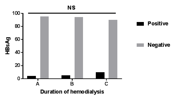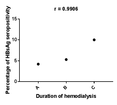 The known fact that the increase of exposure for certain hazard, may associate with high risk of getting harm. In addition, as we reported, regardless of the percentage of HBV infection is increased with the duration of hemodialysis and HBsAg seropositivity is positively correlated with the duration of hemodialysis in this work, our data did not show significant difference in the occurrence of HBV infection which may arise from the use of small sample size in this study.