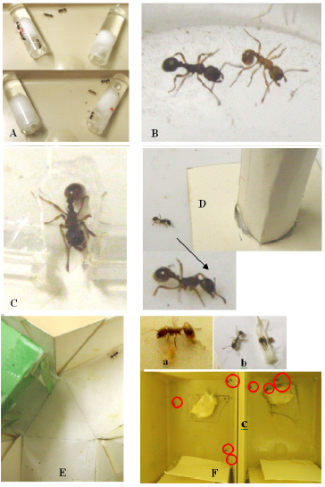The ants have been collected from several regions located in Belgium: the Aise valley (Ardenne), Olloy-sur-Viroin (Ardenne), Marchin (Condroz) and Visé (Basse-Meuse). Each colony was maintained in 1 to 3 glass tubes which contained water and a cotton plug. These tubes were set in a tray in which food, consisting in sugar water and Tenebrio molitor larvae, was delivered several times per week. The lighting of the laboratory was 110 lux while not working on ants, and 330 lux when caring of or experimenting on them. The humidity equaled about 80%, the temperature 20°C and the electromagnetic field 2µWm2.