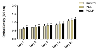 Figure 1 MTT test for cell proliferation at 1, 3, 7, 14 and 21 days at different conditions.