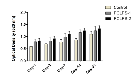 Figure 2 MTT test for cell proliferation at 1, 3, 7, 14 and 21 days at different conditions.