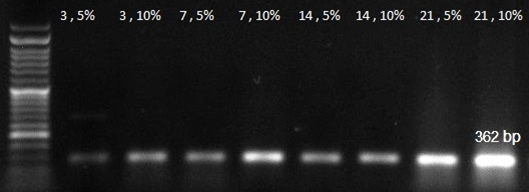 Figure 3 RT-PCR analysis result for collagen 2 gene expression at 3, 7, 14, 21 days in 5% and 10% amount of synovial fluid on modified PCL.