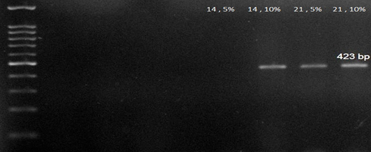 HMSCs cultured for 21 days on PCL scaffold at present and absent of CAP and different amount of synovial fluid carried out. MTT test for cell viability and mRNA expression for differentiation were assessed. MTT assay results in this study showed that the cells proliferation gradually increased from 1 day to 21 days on electrospun nanofibrous scaffold. MTT test for different conditions of cell culture showed at Figure 1 and Figure 2. Cellular attachment and proliferation of hMSCs on PCL substrate modify with He2 plasma, showed higher rate compared to the unmodified scaffold and control in the first day. These results confirmed that modified nanofibrous PCL by He2 plasma has effect on cell proliferation, viability and differentiation due to rough surface of scaffold. For hMSCs, the cell proliferation gradually increased on PCL nanofibrous from 1 to 14 days. But from 14-21 days there has been a downward trend in growth and proliferation. It’s may be due to differentiation state. RT-PCR analyses: An expression analysis for the known chondrogenic markers has-2 and collagen type П genes using RT-PCR was performed for hMSCs differentiation. In this manner, we showed that has-2 and collagen type П were induced during the course of hMSCs differentiation into chondrogenic lineage. In present of PCL substrate and treatment with cold atmospheric plasma and adding 5% and 10%synovial fluid increased collagen type II expression at days 14 and 21, respectively, when compared with the cells cultured in the control groups. Collagen type П gene expression in primary days was low but increase piecemeal that show in Figure 3. Has-2 gene expression is lately and expressed at days 14 and 21 that show in Figure 4.
