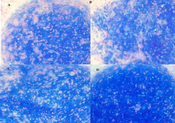 Alcian blue staining confirmed the chondrogenic differentiation of stem cells. High degree of conversion to the chondrocyte observe at 14 and 21st days on modified PCL, with 10% synovial fluid that showed in Figure 5. The A image is Alcian blue staining for 14 days in 5% synovial fluid and B is for 10% amount of synovial fluid on modified PCL. The C image is Alcian blue staining for 21st days in 5% synovial fluid and D is for 10% amount of synovial fluid on modified PCL.