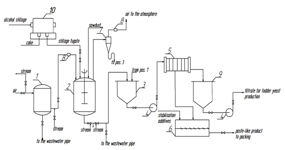 The culture liquid from the fermenter enters the collector (3), from which it is transferred to the frame filter press (5) by the pump (4) to separate the biomass of the fungus. The filtrate of the culture liquid is collected in a collection (9) and used as a nutrient medium component in the production of fodder yeast. To obtain the finished product, it is necessary to add a number of additives that increase the shelf life of the product, which protects the biomass from ultraviolet rays, as well as the effective distribution of oid in the water and the improvement of biomass fixation on the surfaces to be treated.9‒15